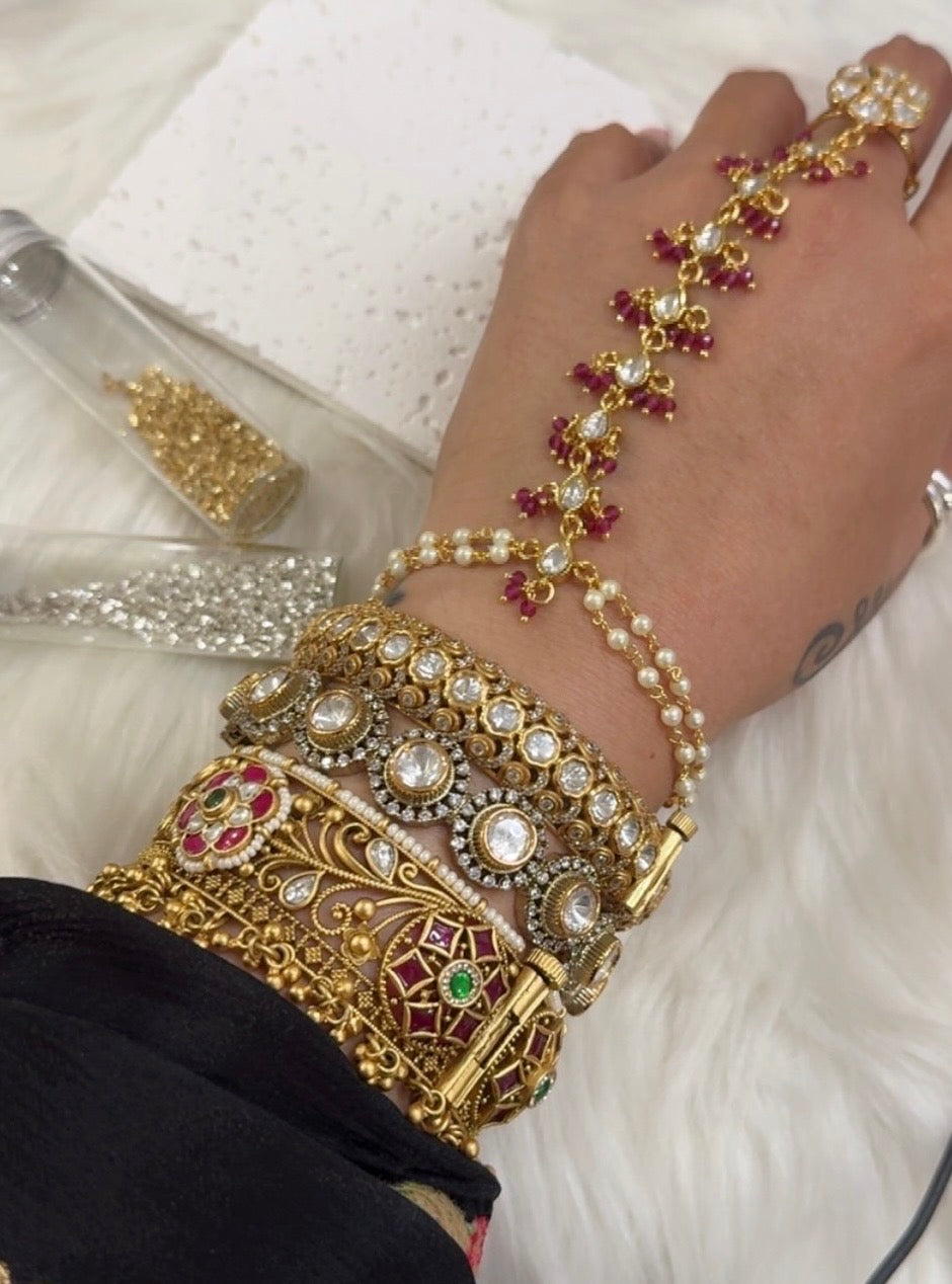 The 22 carat gold plated collection highlights top-notch jewelry with real mosaanite and kundan stones for an authentic look