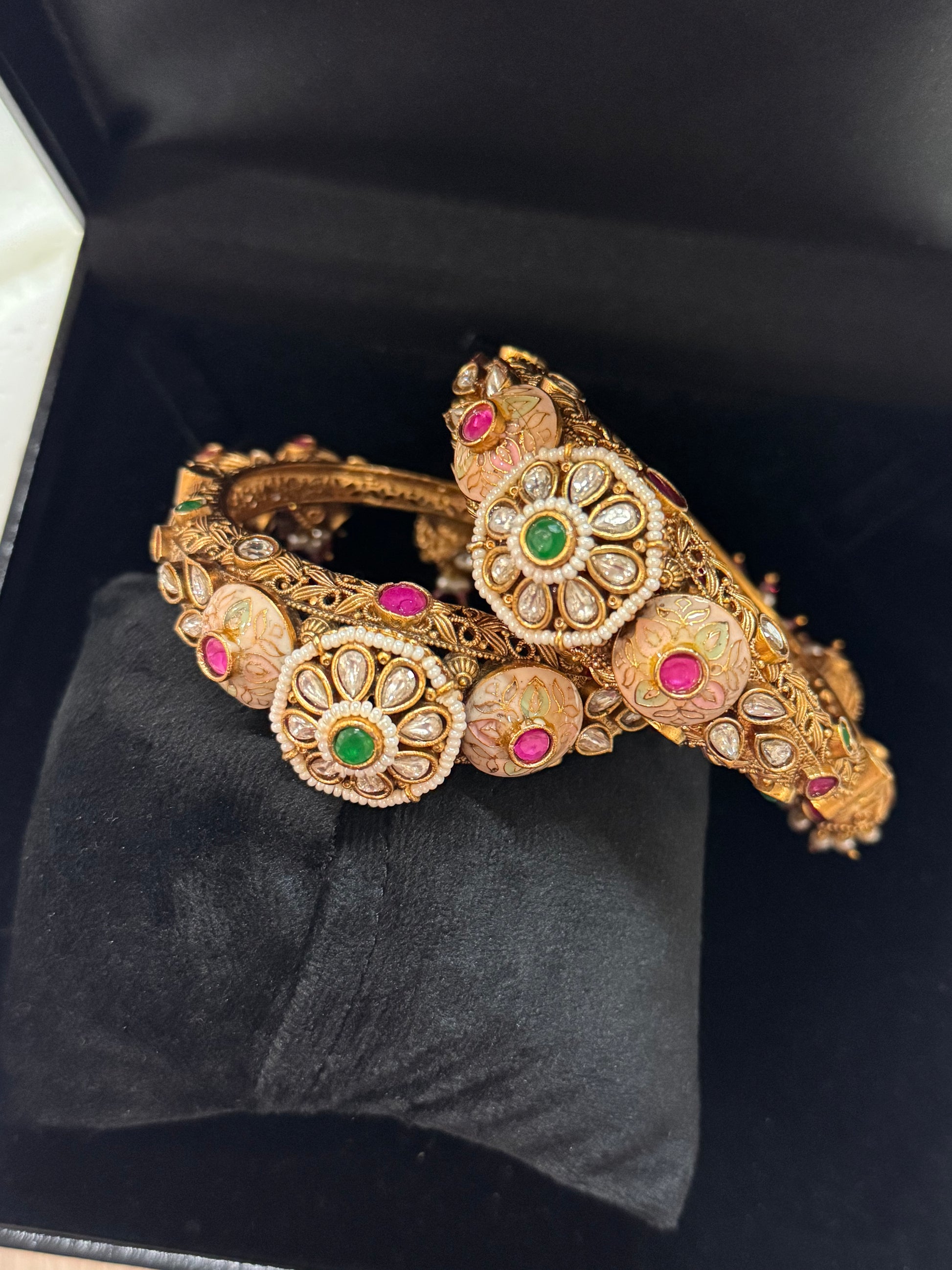 Crafted with expert precision, the FMC1545 Heritage Rajwada Kangan features an openable design for easy wear and removal. Its intricate latkan detailing enhances traditional elegance, making it a distinctive piece that reflects rich cultural artistry while ensuring comfortable fit and functionality.