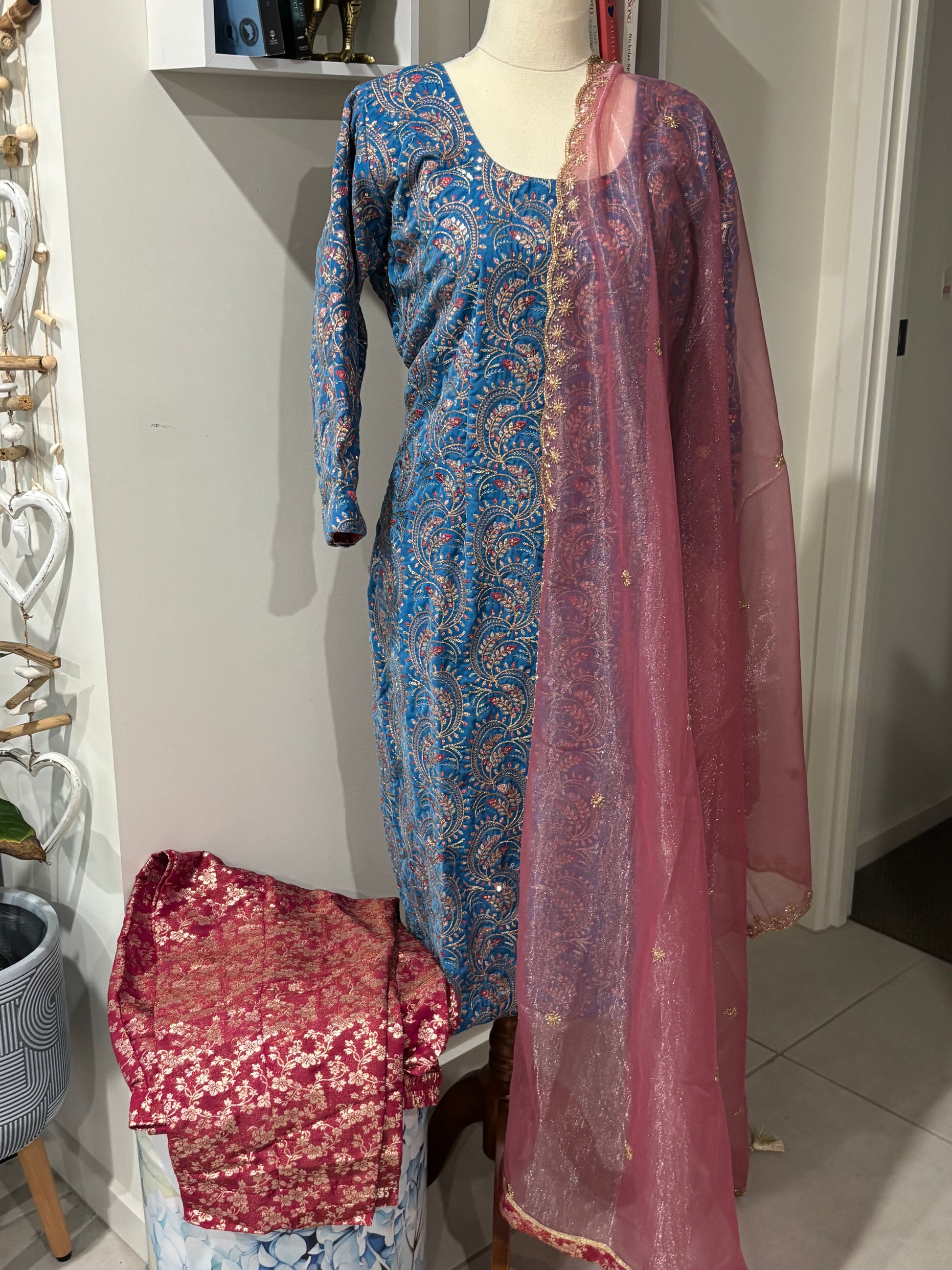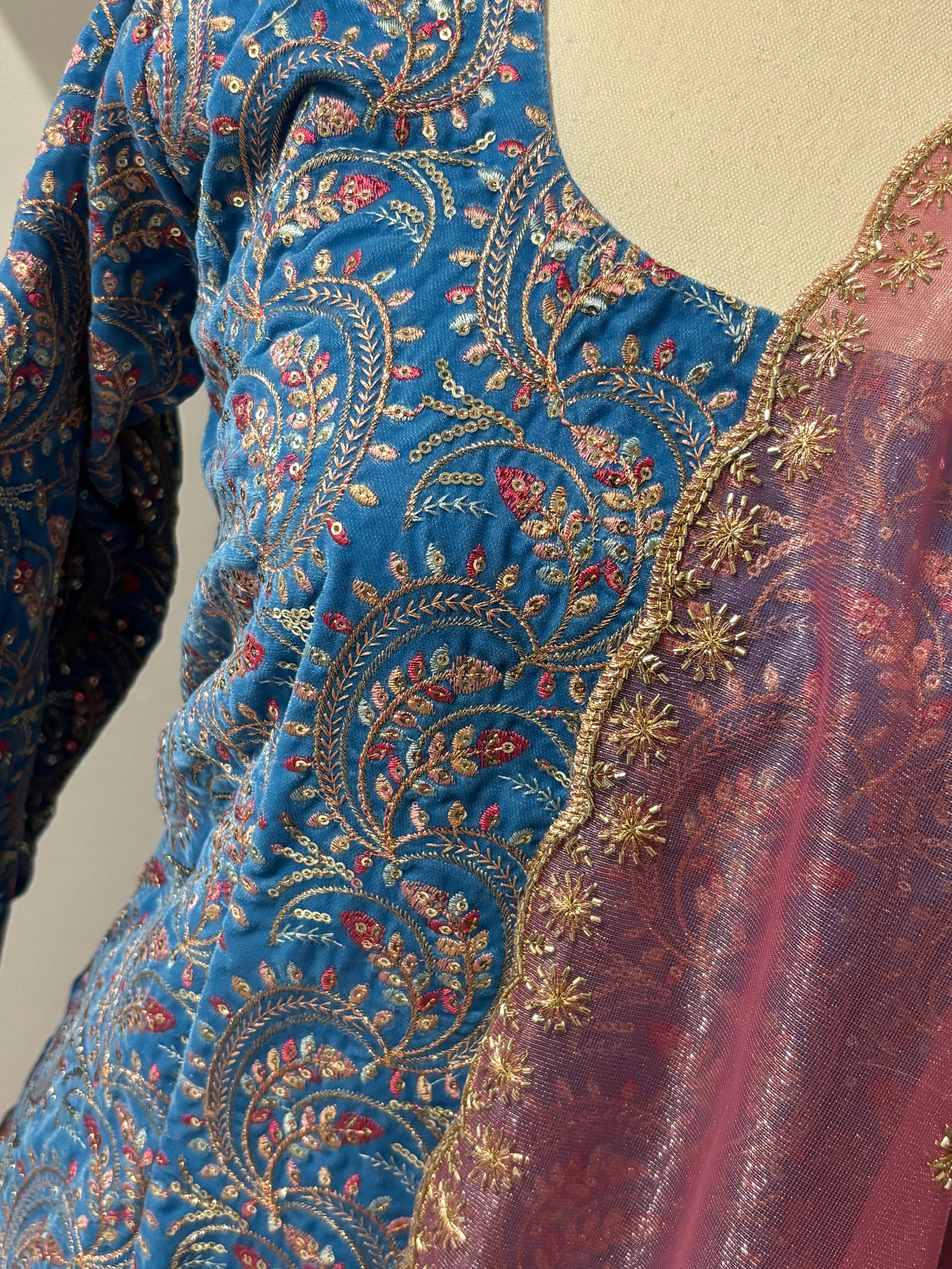 One of its kind - Step into designer velvet pant suit designed for the modern woman who loves traditional charm. Crafted from premium embroidered velvet and banarasi brocade, this outfit drapes beautifully and offers a graceful, perfect for occasions and celebrations.