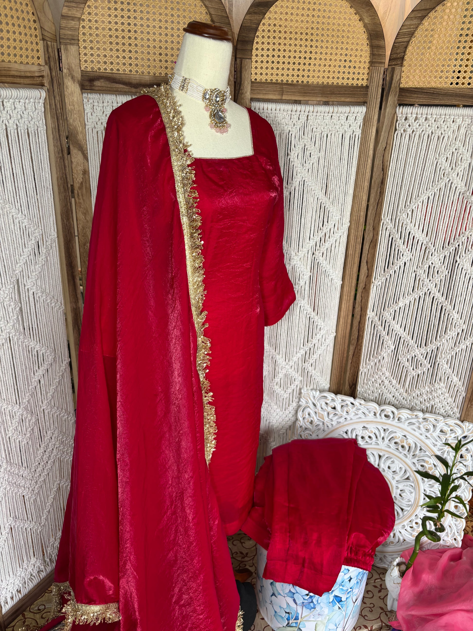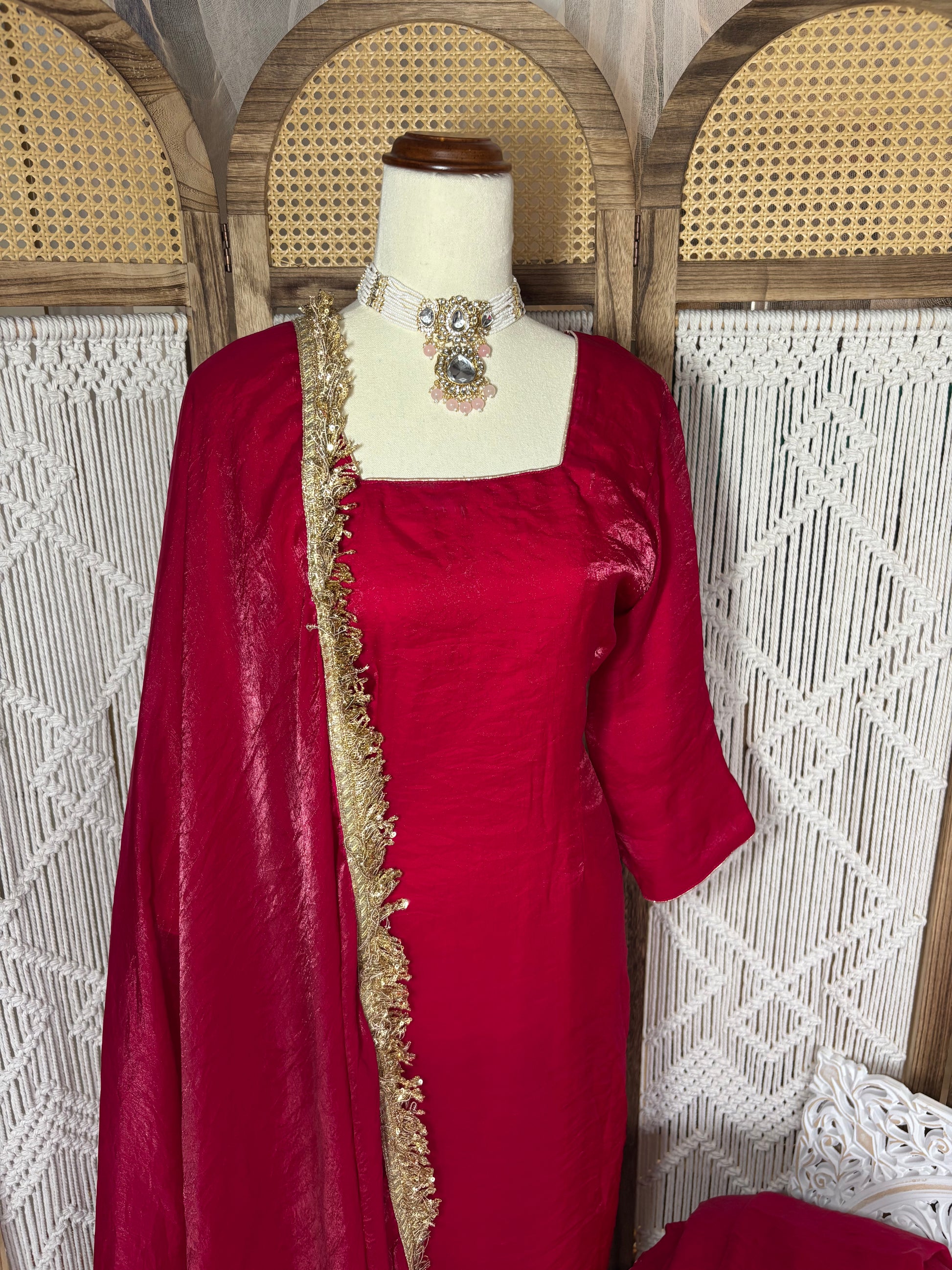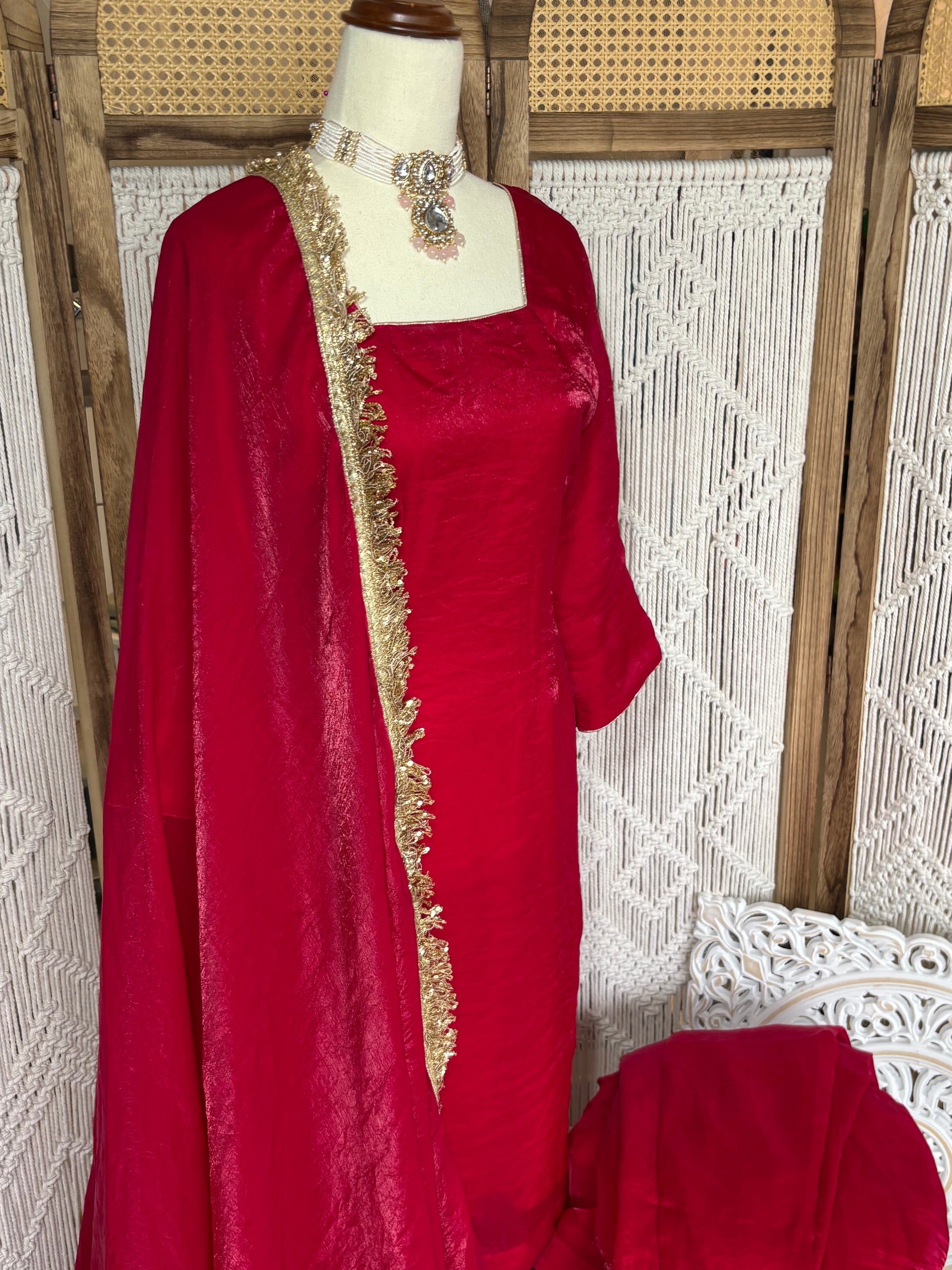 Comes with stunning 2.5 metres dupatta featuring intricate Jhadoo Gotta detailing, adding a touch of sparkle and heritage craftsmanship that elevates the entire look. Paired with the pant it creates a statement silhouette that blends timeless tradition with contemporary fashion.