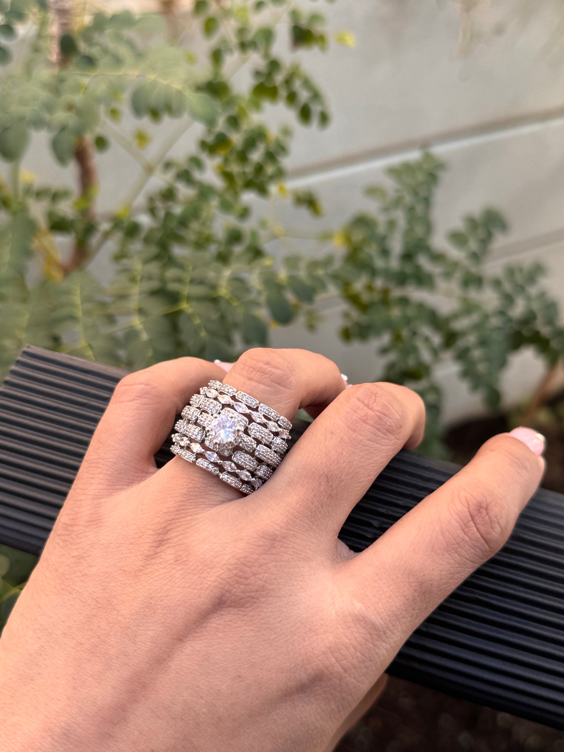 Band style high mounted Ring in pure cubic zirconia and silver plating, an non tarnishing material for longer lasting polish