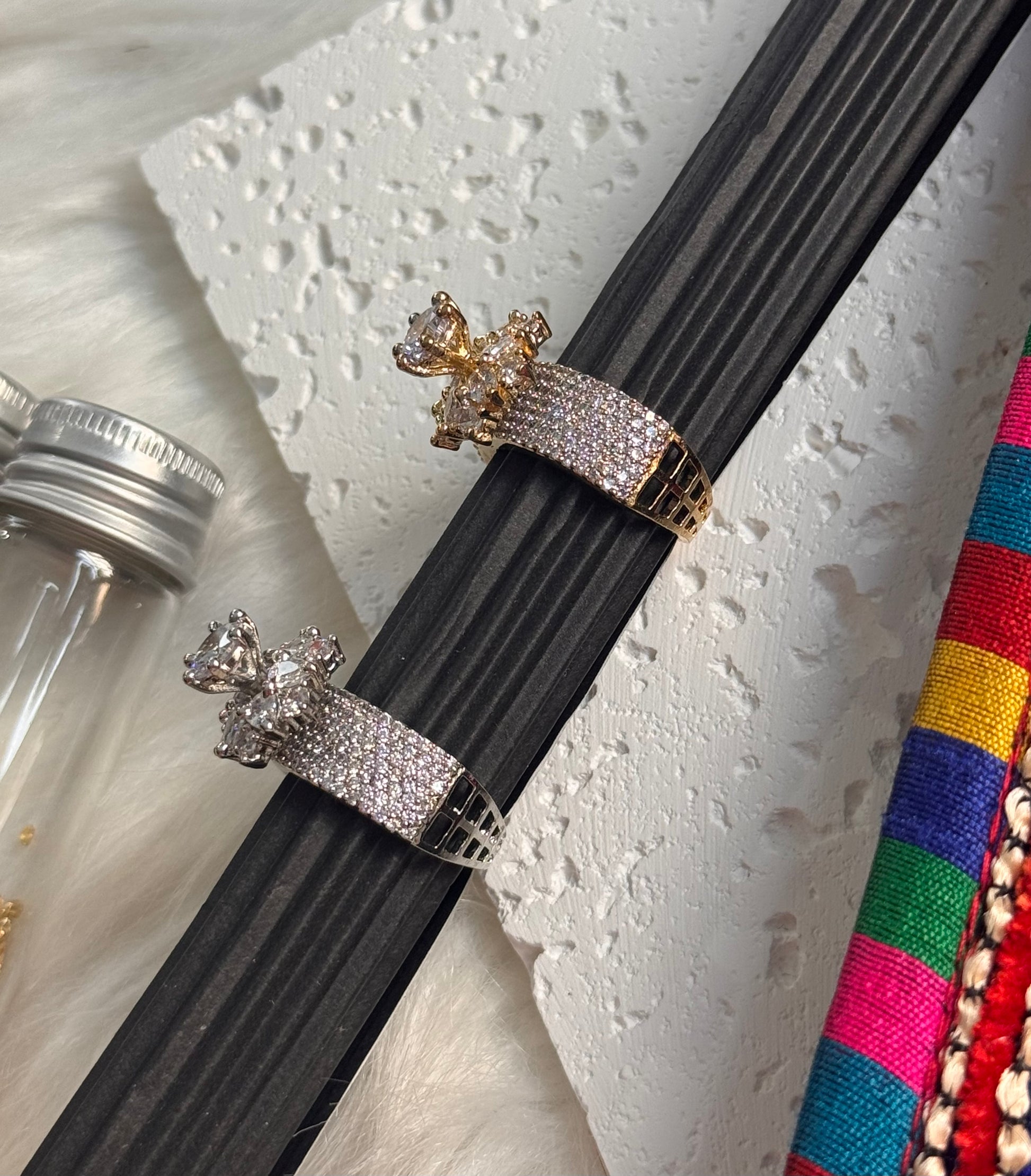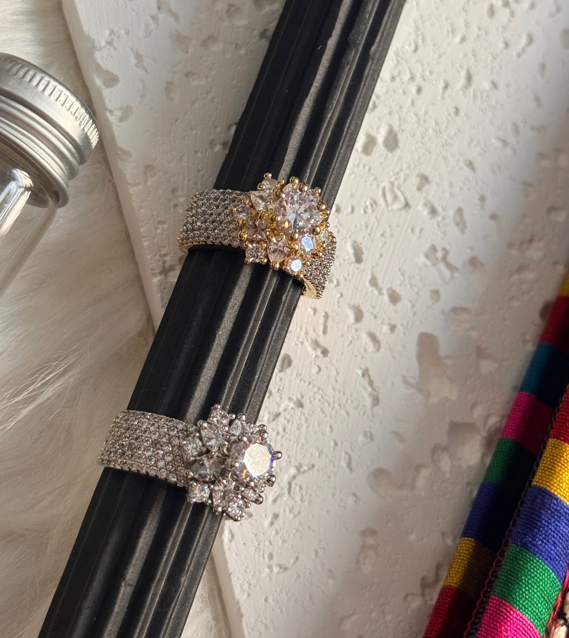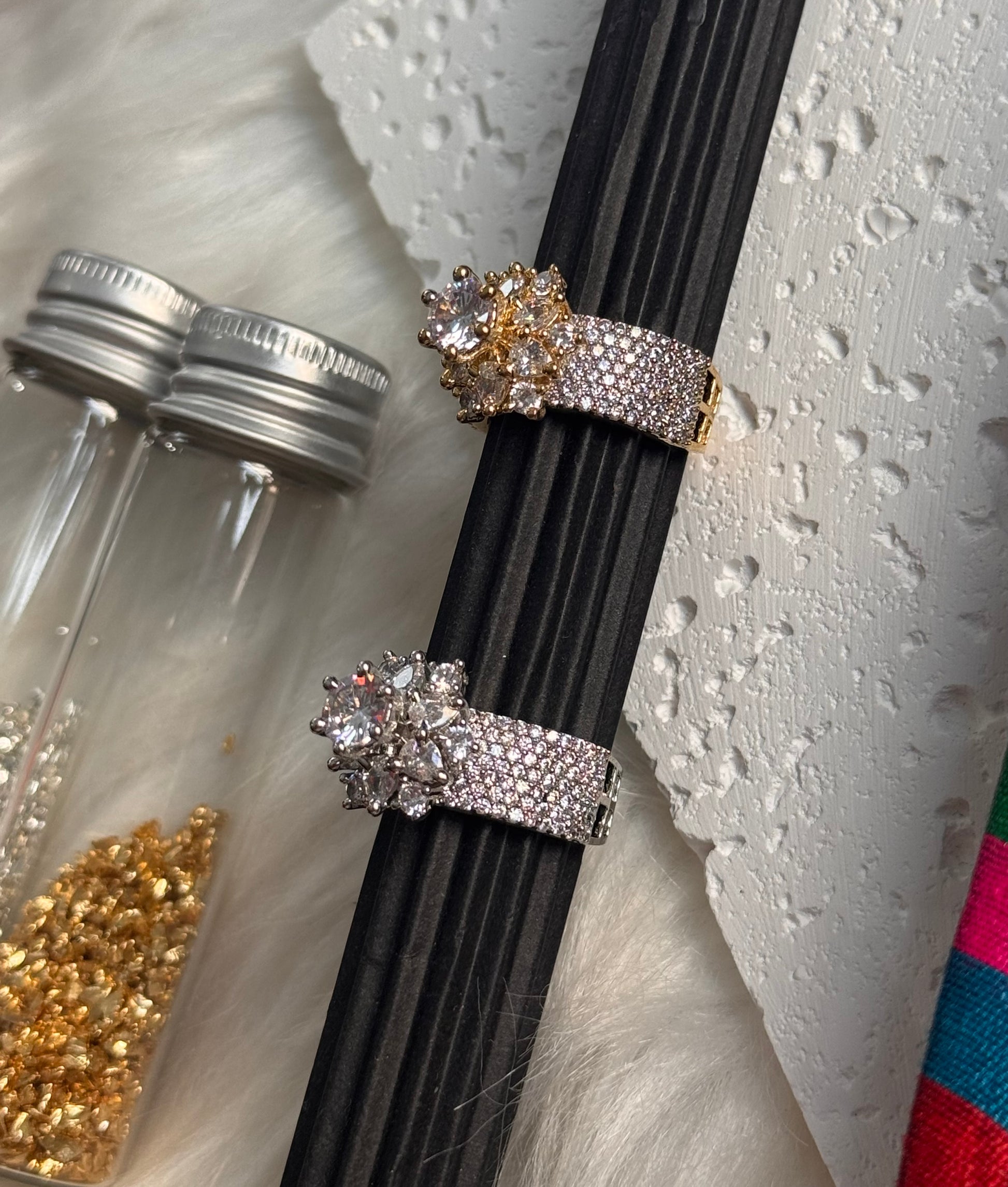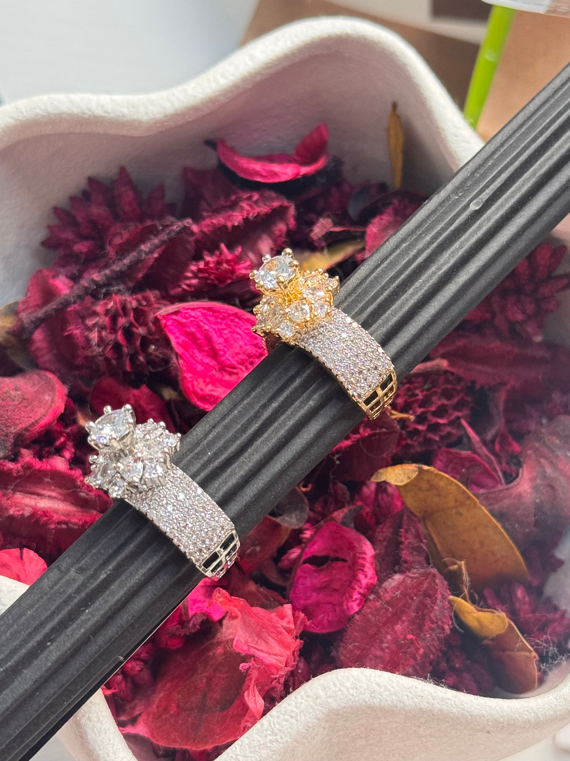 This stunning AD ring features a solitaire style and sparkling American diamonds, exuding elegance and luxury. Perfect for adding a touch of sophistication to any outfit.