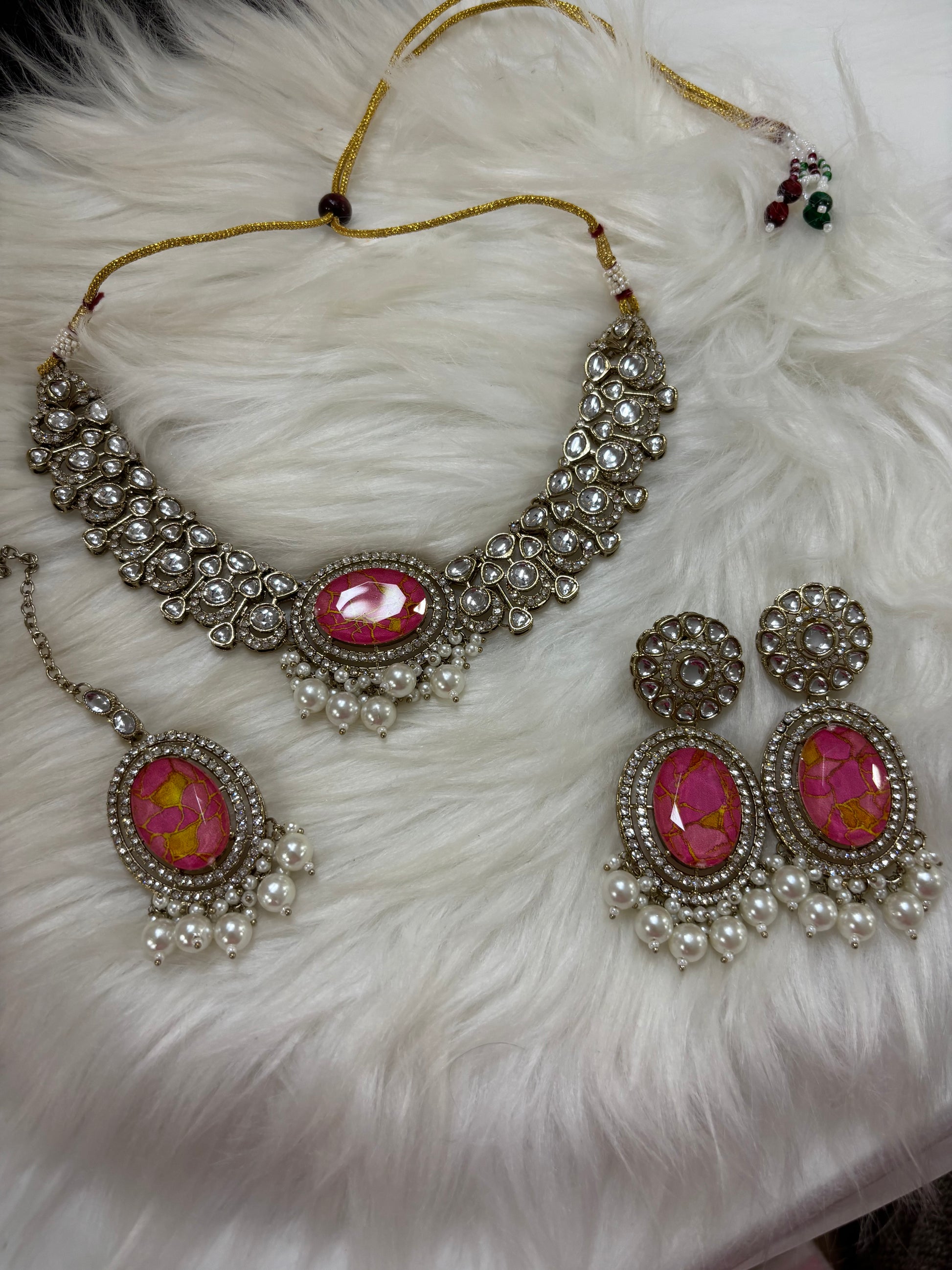 This kundan necklace set includes a matching pair of earrings and a maangtikka, offering a complete traditional look at an affordable price. The intricate kundan work adds elegance to any occasion, whether you're dressing up for a celebration or special event. A practical choice for those who want authentic style without the premium cost.