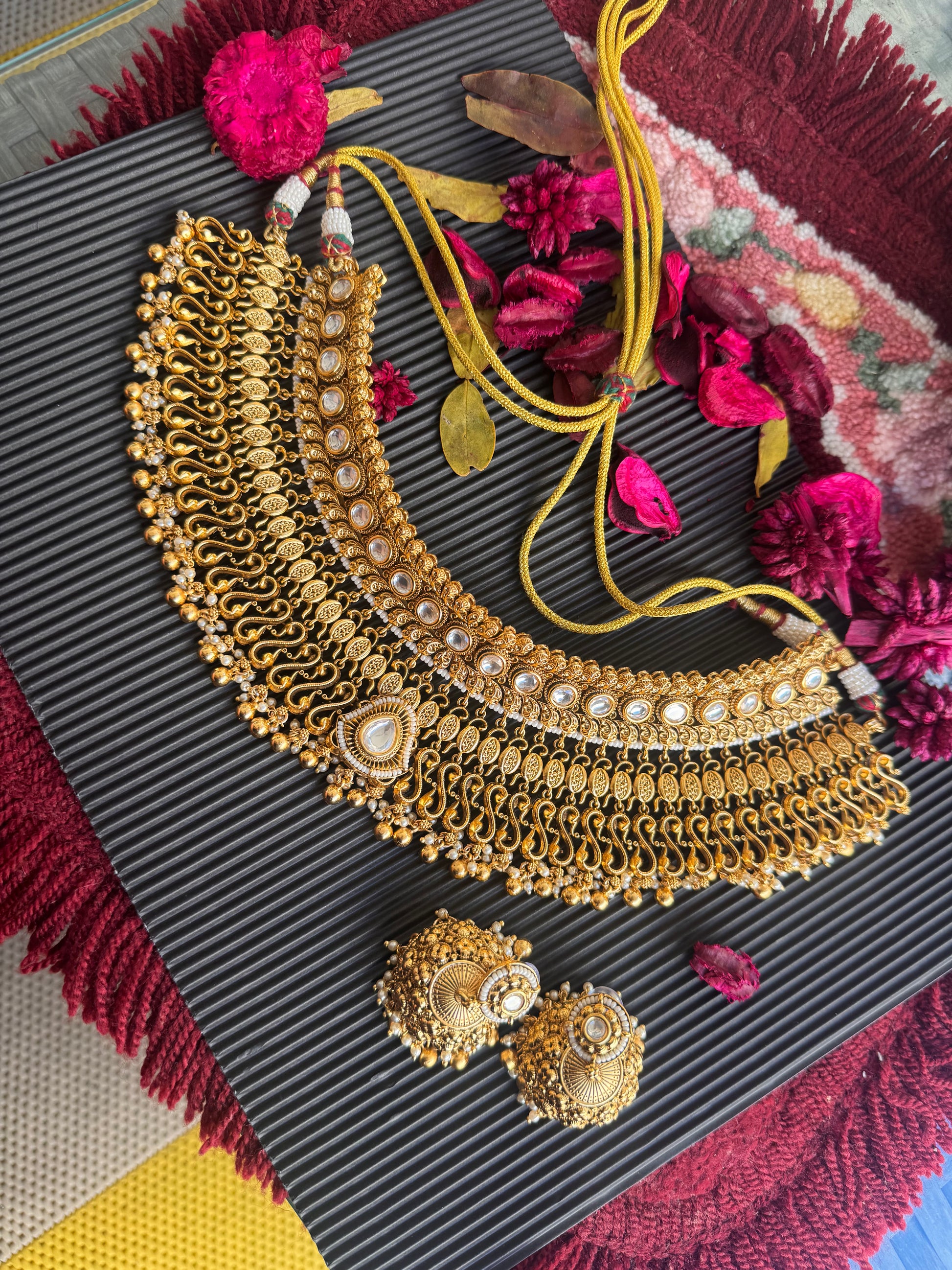 This elegant necklace boasts antique-inspired design and is adorned with genuine gold plating, accompanied by charming jhumki details.