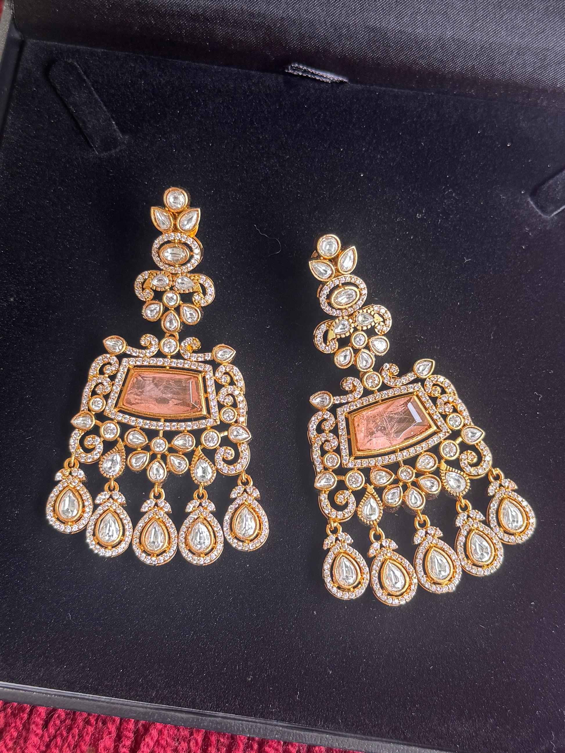 Gracefully designed mossanite Kundan earrings with natural potta stone