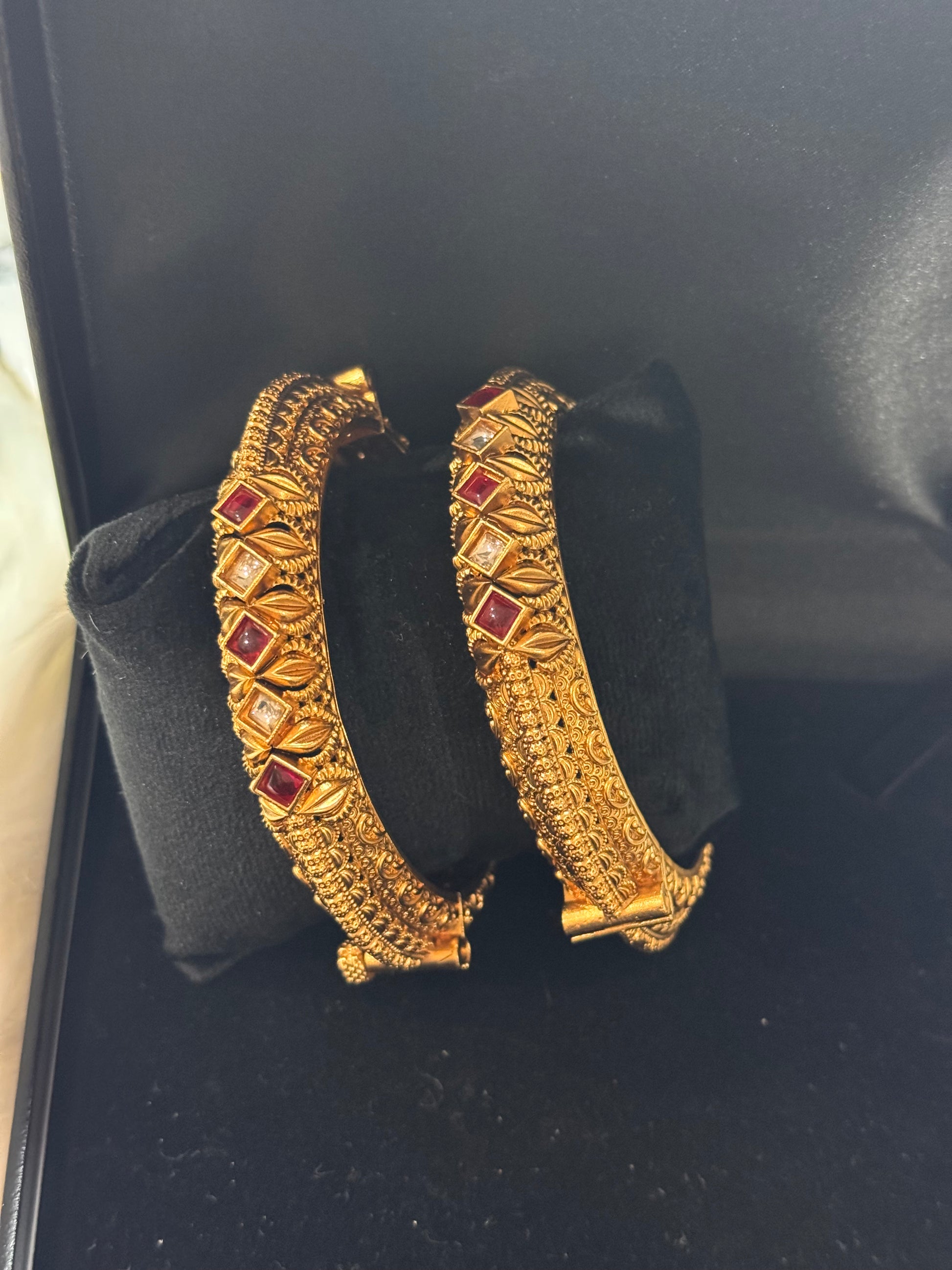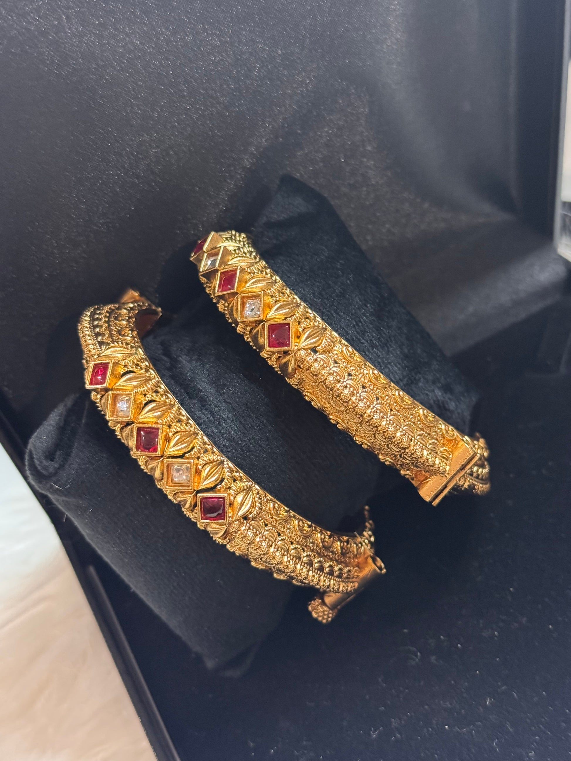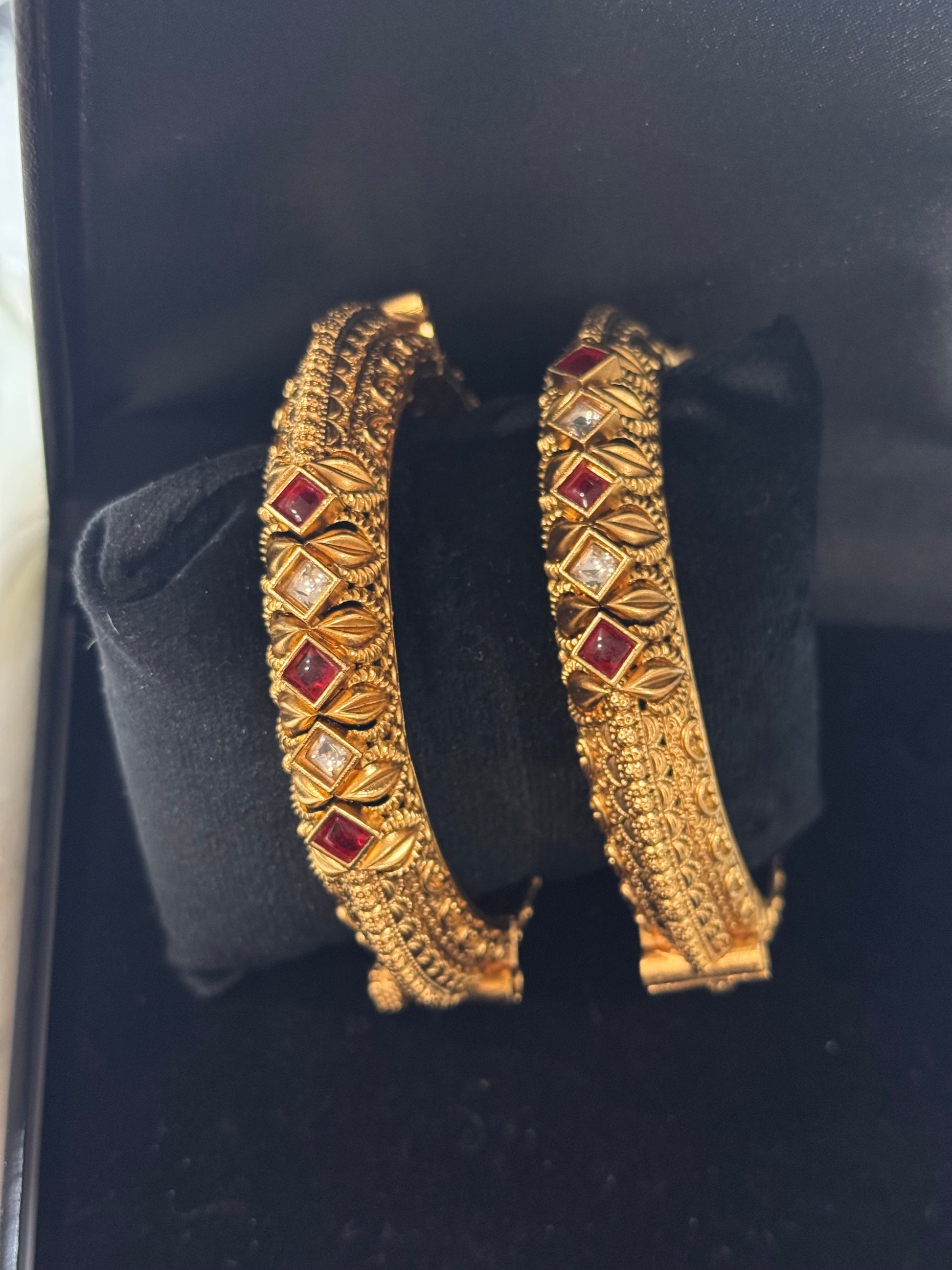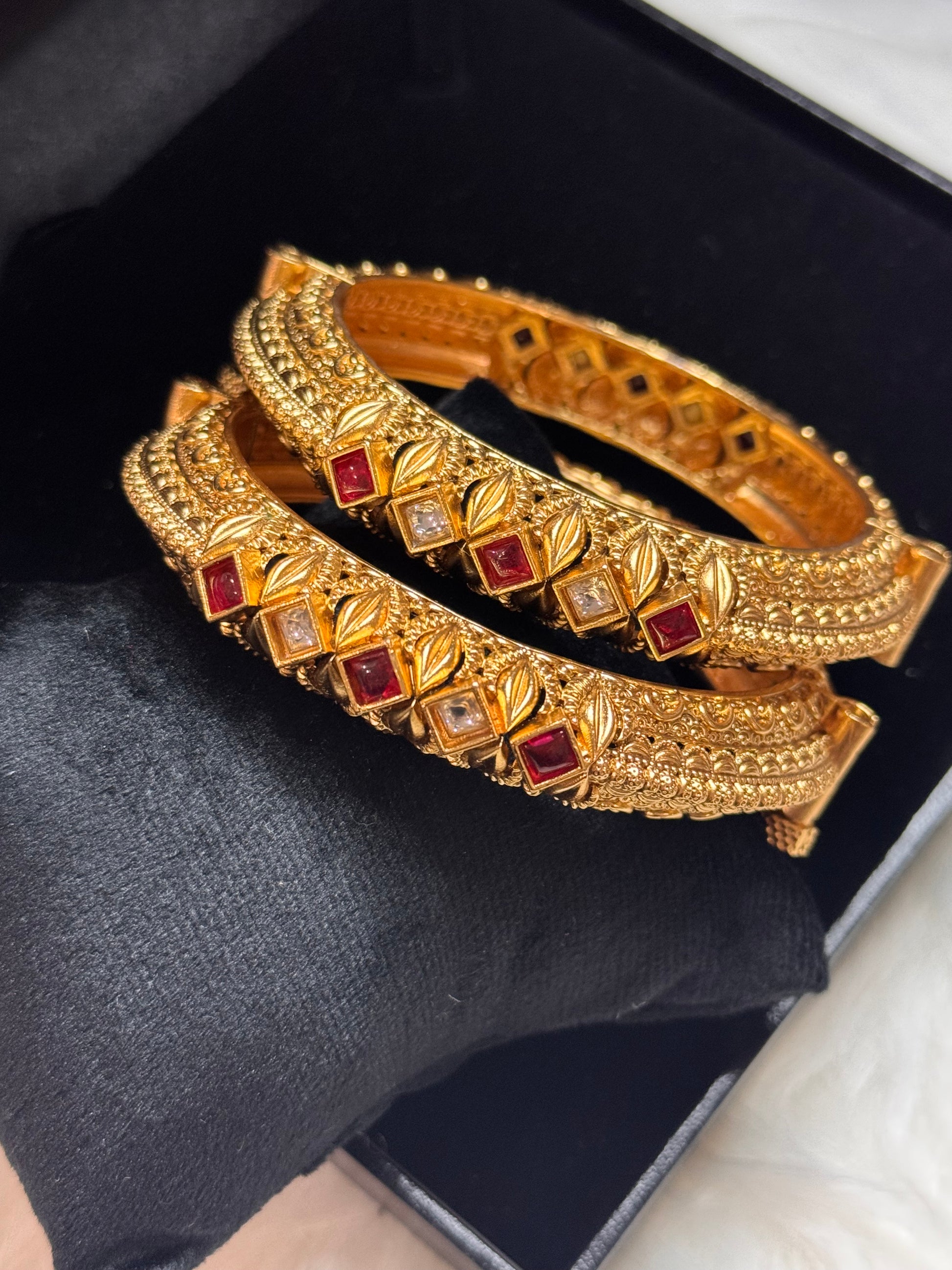This pair of openable kangans features a classic Rajwada design, blending traditional artistry with practical wearability. Crafted for elegance and ease, they allow effortless adjustment while showcasing timeless style. Perfect for those appreciating heritage-inspired jewelry that combines functionality with regal charm.