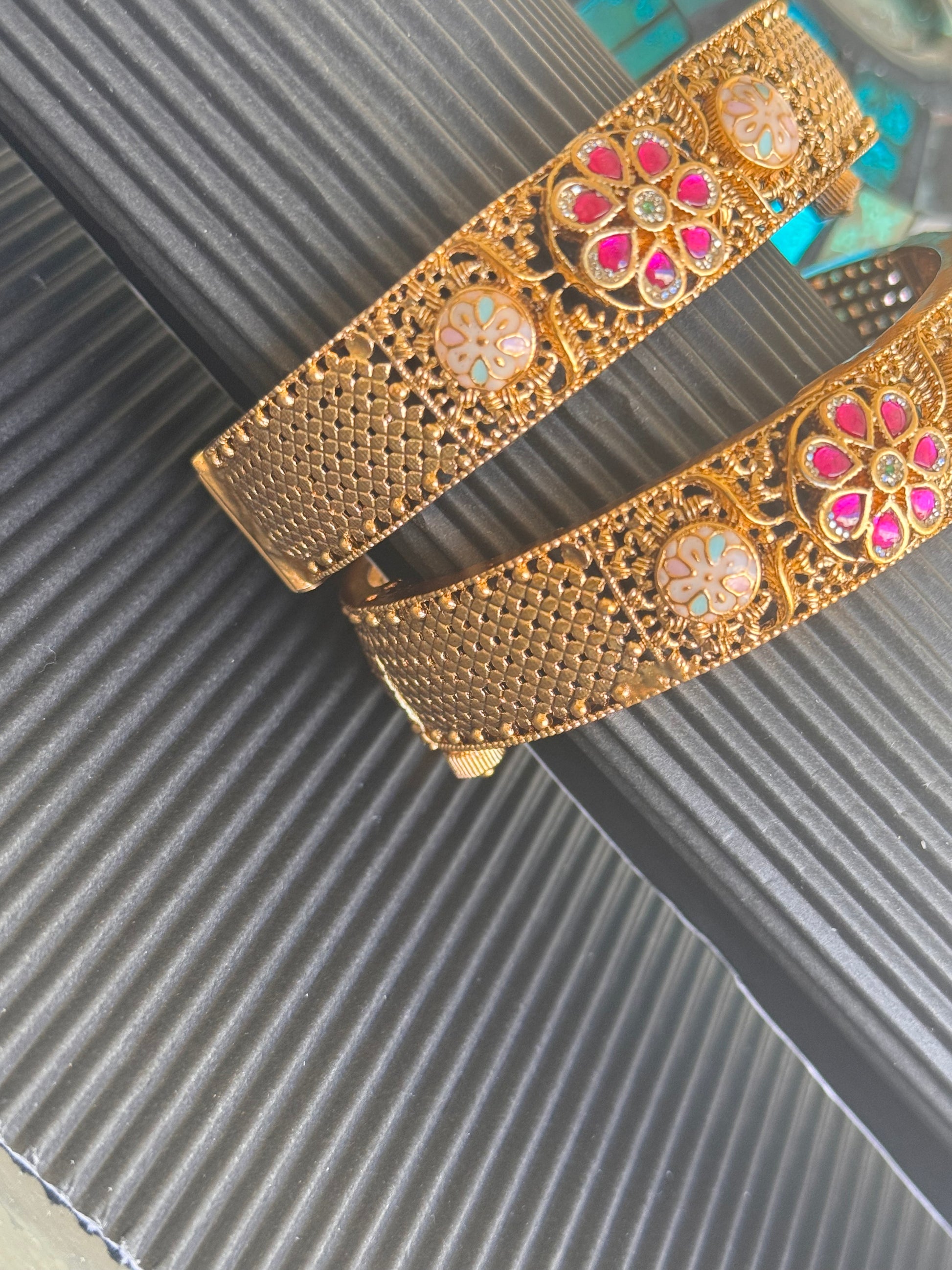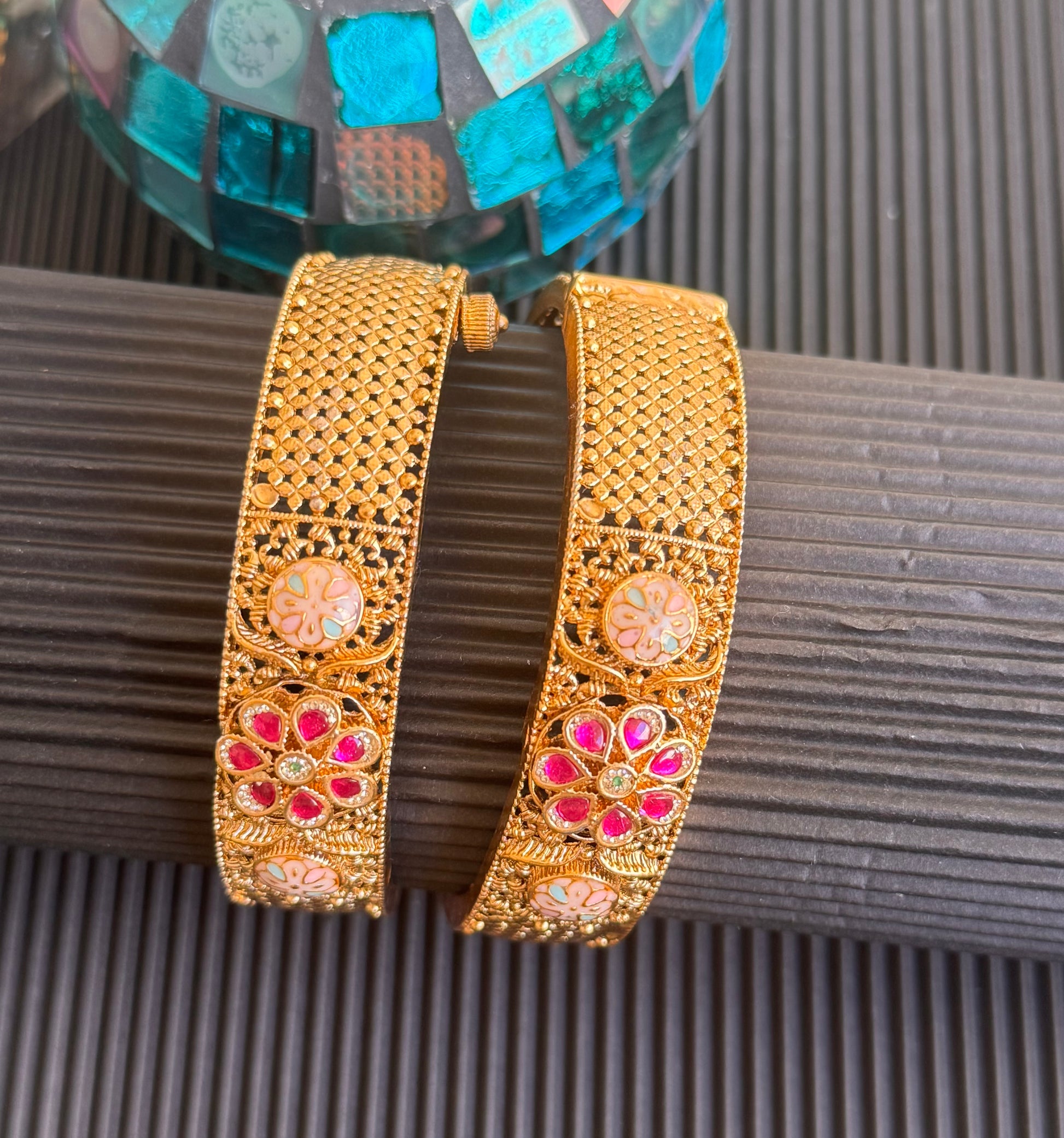 Gold plated flat Kangan embellished with pink stones and meenakari