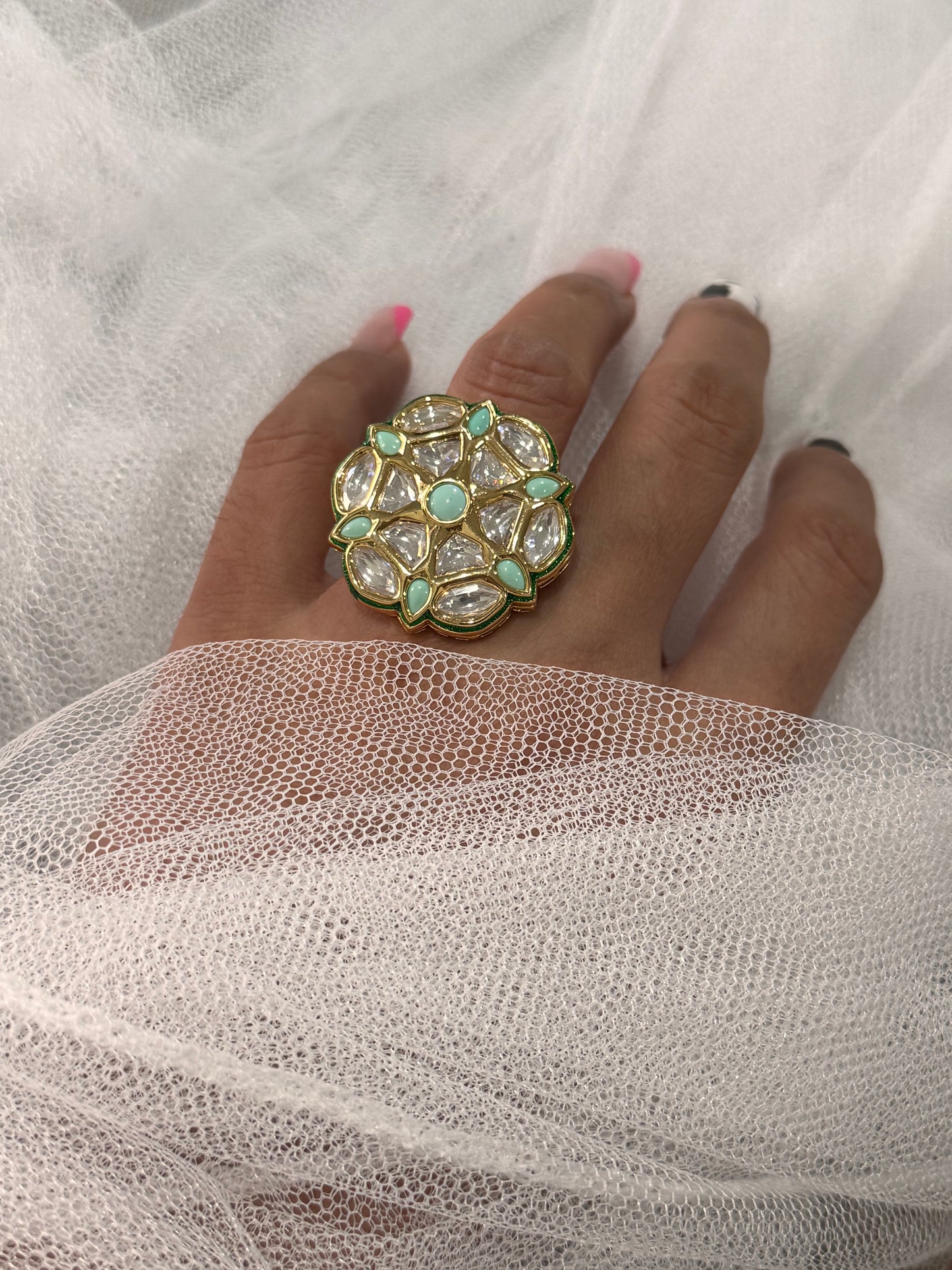 Crafted with precision using uncut kundan gemstones, this ring offers a unique and elegant touch to any outfit. Embrace the timeless beauty of Kundan jewelry while enjoying its durability and long-lasting shine. You'll love the versatility and luxury this ring adds to your collection.